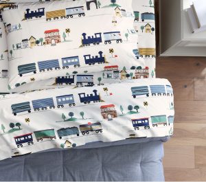 My child’s bedroom was transformed into a cozy retreat with Pottery Barn Kids’ bedding and curtains. I got to choose from various adorable themes and patterns, such as the playful Train Organic Sheet Set paired with the Evelyn Cordless Blackout Roman Shade for a peaceful night’s sleep.